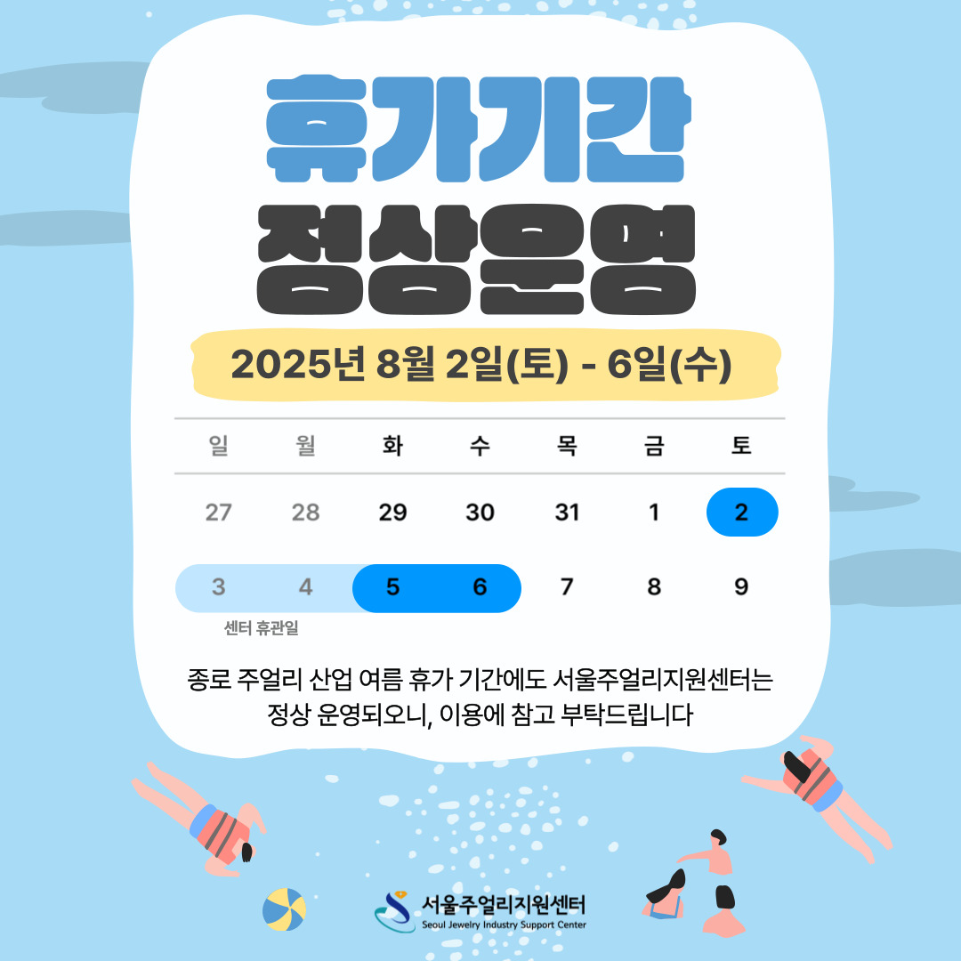 종로 주얼리 산업 여름 휴가 기간에도 서울주얼리지원센터는 정상 운영되오니, 이용에 참고 부탁드립니다.