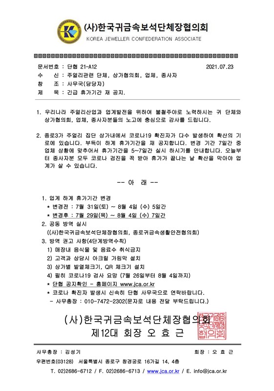 (사)한국귀금속보석단체장협의회의 '긴급 휴가기간 재 공지' 내용 공유드립니다.